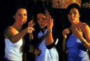 Piper (Holly Marie Combs, l.) und Phoebe (Alyssa Milano, r.) versuchen, mit Hilfe des Spiritismusbrettes den Namen des Dämonen zu erfahren, der ihnen das "Buch der Schatten" gestohlen hat.