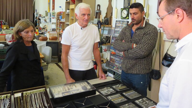 Inge (li.), Hinrich (2.v.li.) und Trödelexperte Sükrü Pehlivan wollen Schmuck verkaufen.