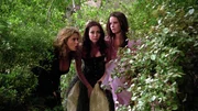 • Die gute Hexe Eva (Clare Carey, l.) bittet Piper (Holly Marie Combs, 2.v.l.), Phoebe (Alyssa Milano, 2.v.r.) und Prue (Shannen Doherty, r.), ein Baby zu retten ....