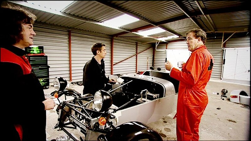 Der Testfahrer brettert im Caterham Richtung Schottland. Dort bauen Jeremy Clarkson, Richard Hammond und James May in einer Garage am Knockhill-Track ein weiteres Modell der britischen Marke zusammen.