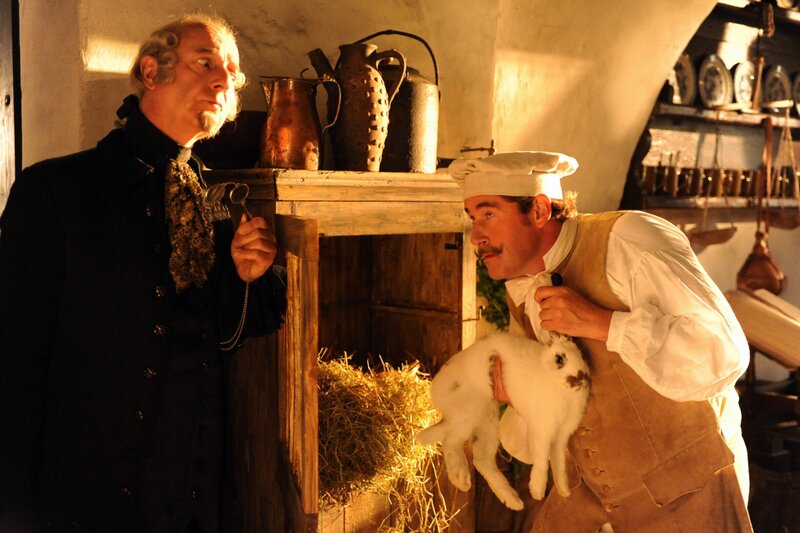 • Von links: Julius (Michael Schönborn) prüft beim Koch (Stephan Szasz) den Hasen.