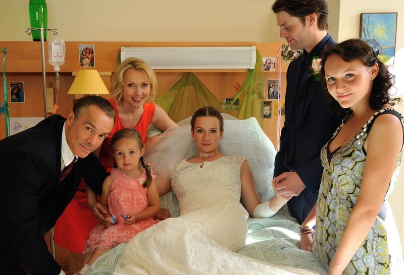 Haben Marla (Nina Gummich, 3.v.r.) und Isko (Johann David Talinski, 2.v.r.) die Chance auf eine gemeinsame Zukunft? Harald (Hannes Jaenicke, l.), Sabine (Dana Golombek, 3.v.l.), Floh (Nina Monka, r.) und Töchterchen Ylvie (Merle Johanna Knecht, 2.v.l.) feiern Hochzeit in der Klinik ...