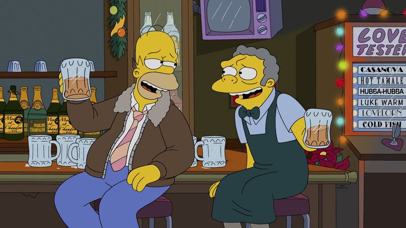 Eigentlich hat Homer vor, Marges Wünschen zu entsprechen und Heiligabend pünktlich von der Arbeit nach Hause zu kommen. Als er nur kurz bei Moe reinschauen will, hält der ihn auf, weil er einsam ist.