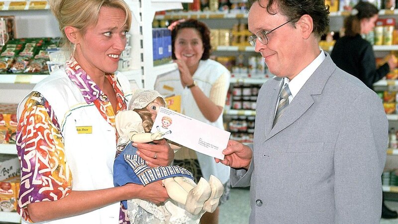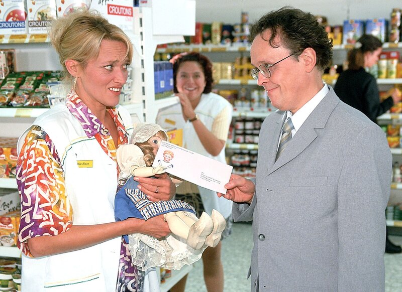 Das kann ja heiter werden! Puppenverbandsvorsitzender Herr Heinlein (Horst Scheel) lädt fälscherlicherweise Rita (Gaby Köster, l.) statt Gisi (Franziska Traub) zum Puppenwettstreit ein.