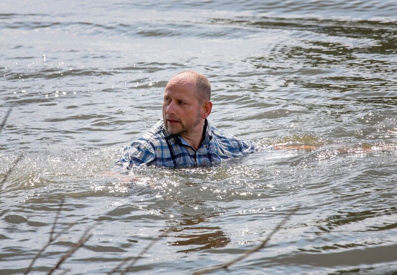 Die Kommissare Finn Kiesewetter (Sven Martinek, l.) und Lars Englen (Ingo Naujoks, M.) stellen Gerd Siebert (Achim Buch, r.) erneut zur Rede.