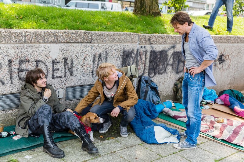 Stefan (Stefan Duryn, r.) stolpert zwischen ein paar Problemkids im Park über Schüler Fabian (Paul Falk, M.), der nach einem Streit mit seinem Vater zuhause abgehauen ist. (l. Komparse)