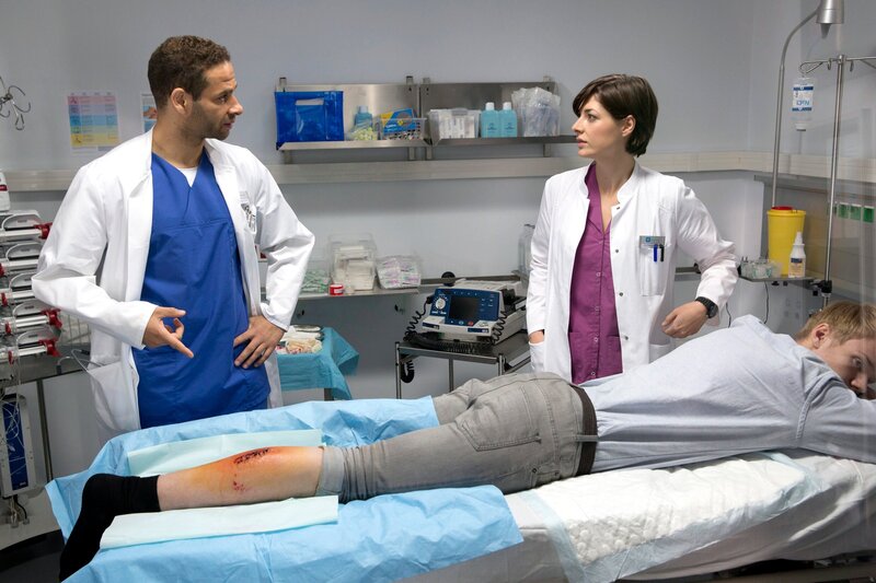 ARD PROGRAMMDIREKTION, IN ALLER FREUNDSCHAFT - DIE JUNGEN ÄRZTE, neue Vorabend-Weekly mit 42, Folgen 2 "Freunde und Familie", am Donnerstag (29.01.15) um 18.50 Uhr im Ersten. Dr. Matteo Moraeu (Mike Adler, l.) ist verärgert über die schlecht genähte Wunde; er fordert Dr. Theresa Koshka (Katharina Nesytowa, r.) auf, noch einmal neu zu nähen.