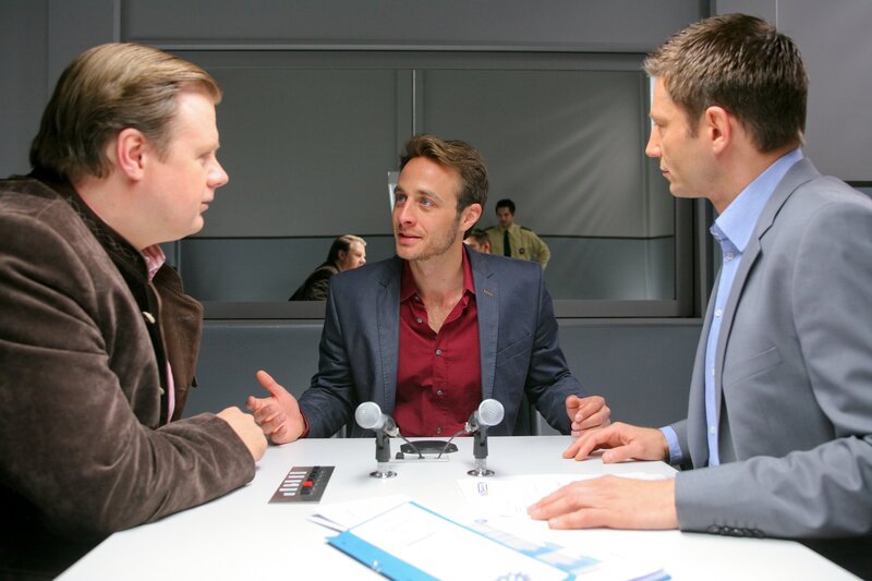 Hat Peter Herbst (Gabriel Raab, m.) seine Stiefschwester ermordet, um an das Erbe zu kommen? Für die Cops (Michael A. Grimm, l.; Igor Jeftic, r.) ein klares Tatmotiv.