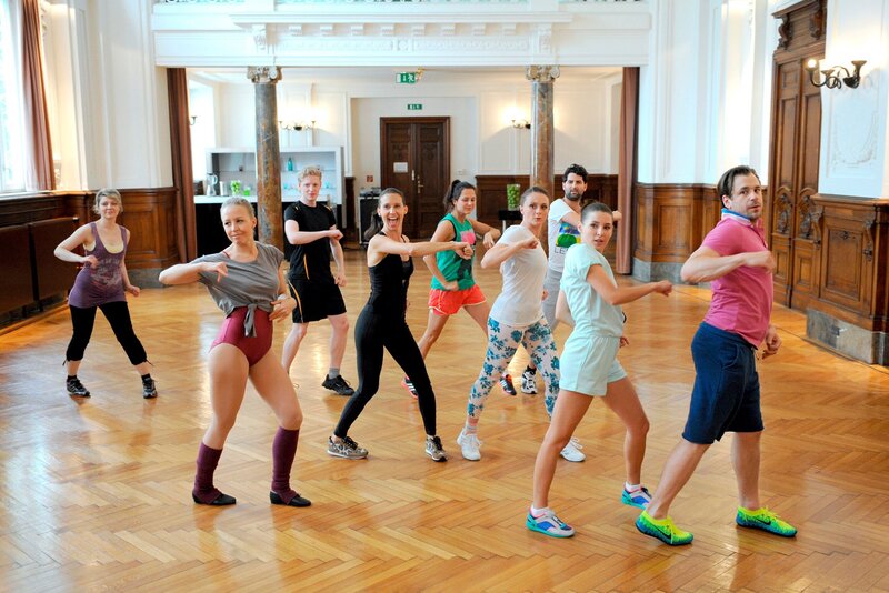 ARD VORSTADTWEIBER, neue Serie mit 10 Folgen, Folge 2 am Dienstag (05.05.15) um 21.00 Uhr im Ersten. Die "Vorstadtweiber" absolvieren ein strenges Fitnessprogramm. v.l.n.r. Nicolette Huber (Nina Proll), Waltraud Steinberg (Maria Köstlinger), Maria Schneider (Gerti Drassl), Caroline Melzer (Martina Ebm), Marko (Nikolaus Barton) mit Komparsen (hintere Reihe).