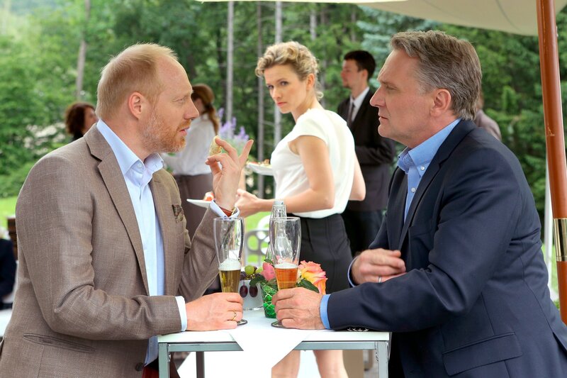 • Sabine hat einen Job beim Partyservice - sie serviert Champagner bei einer Networking-Party und trifft auf Josef Steinberg (Simon Schwarz, links) und Hadrian Melzer (Bernhard Schir, rechts).