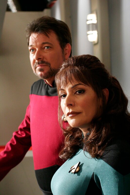 Riker (Jonathan Frakes, l.) hat psychische Probleme und erhält von Troi (Marina Sirtis, r.) den Rat, sich Aufzeichnungen von den Missionen der ersten Enterprise anzusehen.