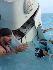 • L-R: Joe Teti und Matt Graham im Wasser mit Teilen aus dem Flugzeug.