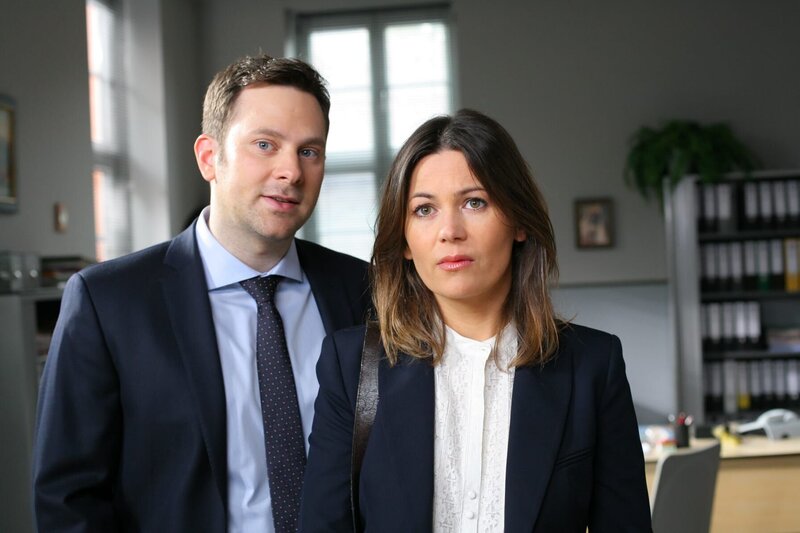 Kommissar König (Mark-Alexander Solf, l.) verdächtigt Landschaftsfotografin Sandra Rieger (Jeanne Tremsal, r.) eine Affäre mit dem Opfer gehabt zu haben.