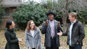 Hosts Chip (L) and Joanna Gaines (CL) pose for a portrait with homeowners Denitia (CR) and Norris Blount (R) in their renovated house, as seen on Fixer Upper. (after, interior, portrait)