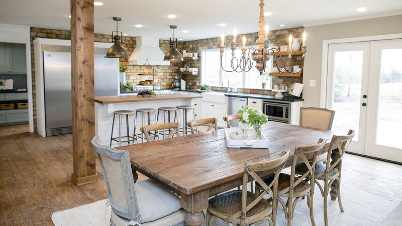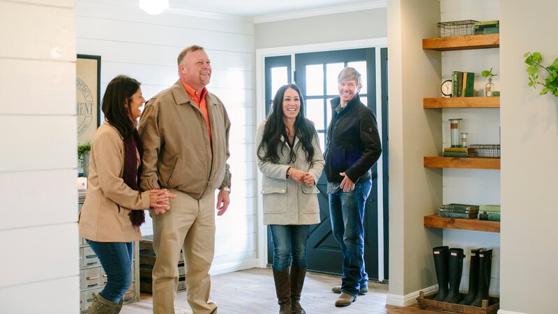 Homeowners Deanna and Paul King are all smiles as hosts Joanna and Chip show them their newly renovated home, as seen on Fixer Upper. (action)