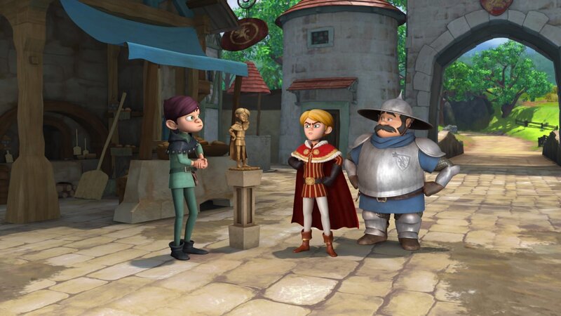 Der Bildhauer präsentiert Prinz John und dem Sheriff die Statue von Prinz John. Prinz John ist empört.