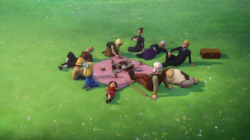 • Heidi, Clara, Peter, Sebastian, Dete, Fräulein Rottenmeier, Claras Großmutter, Herr Sesemann, Großvater und Josef haben es sich auf einer Wiese zum Picknick bequem gemacht. Alle sind von den Bergen begeistert.