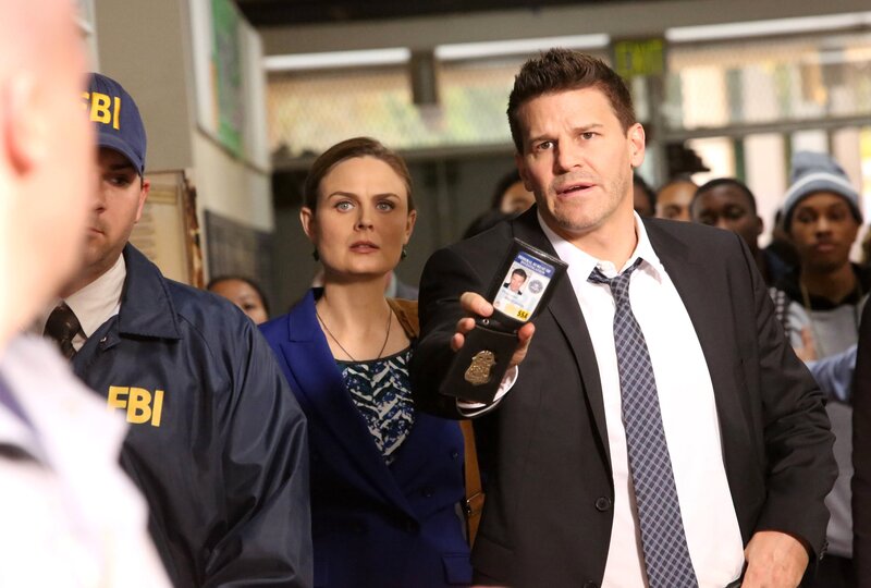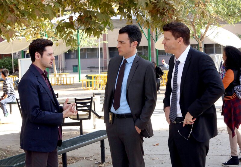 Booth (David Boreanaz, r.) und Agent Aubrey (John Boyd, M.) befragen einen Kollegen des Opfers, Shane Garnett (Brendan Robinson), der ihnen versichert, dass die Lehrerin äußerst beliebt war.