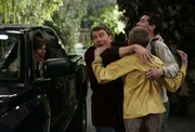 "Malcolm mittendrin", "Der Luftschutzbunker." Malcolm nimmt an einem Kurs für Volkstänze teil, denn dort ist auch ein Mädchen eingeschrieben, das ihm gefällt. Bald muss er feststellen, dass seine Angebetete kein Taktgefühl besitzt und er eine neue Partnerin braucht, wenn er den anstehenden Tanzwettbewerb gewinnen will. Inzwischen versucht Hal vergeblich, sich aus einem Bunker zu befreien, in den ihn seine Söhne gesperrt haben. Im Laufe der Zeit beginnt er Gefallen an seinem Gefängnis zu gewinnen.Im Bild (v.li.): Jane Kaczmarek (Lois), Bryan Cranston (Hal), Erik Per Sullivan (Dewey), Justin Berfield (Reese).
