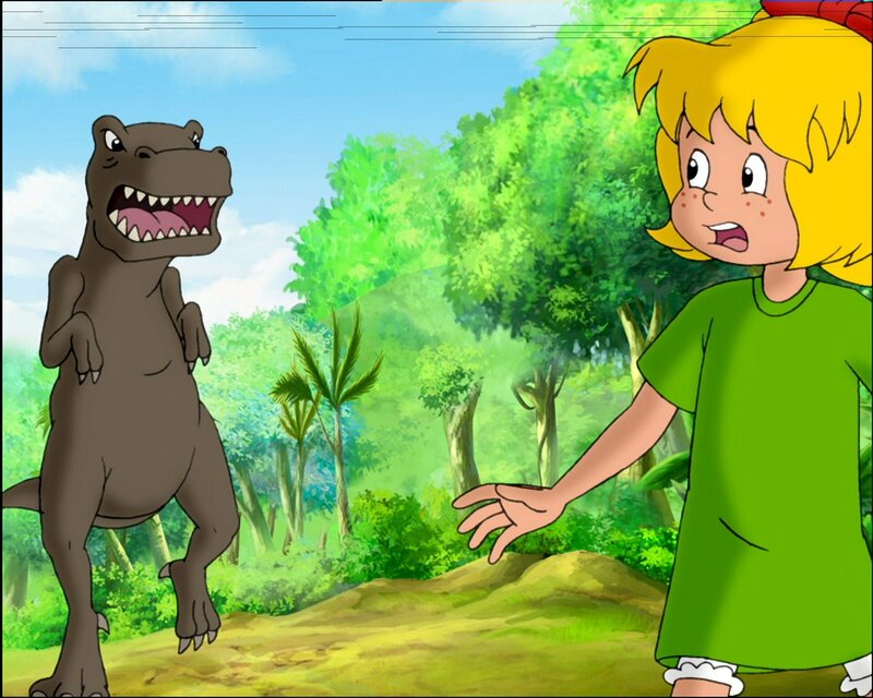 Gegen den gigantischen angriffslustigen Tyrannosaurus Rex kann Bibi mit ihrer Hexkraft nichts ausrichten.