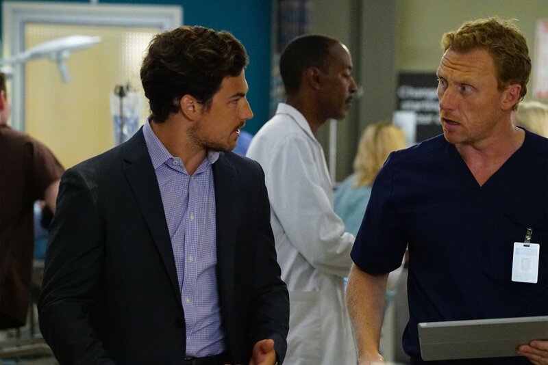 • Owen (Kevin McKidd, r.) bittet Dr. Andrew DeLuca (Giacomo Gianniotti, l.), der eine Verletzte ins Krankenhaus gebracht hat, um Mithilfe ...