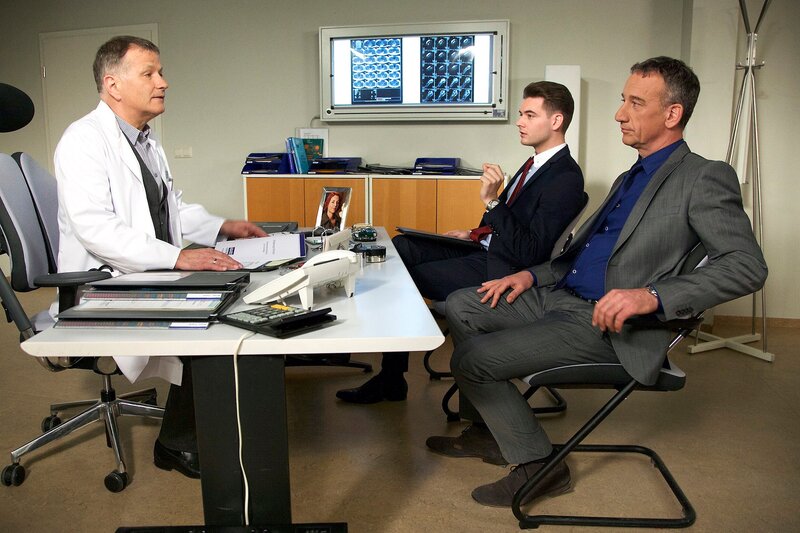 MDR Fernsehen IN ALLER FREUNDSCHAFT FOLGE 688, "Zu einem hohen Preis", am Sonntag (14.06.15) um 18:05 Uhr. Der Abariskonzern-Chef Alexander Weber (Heio von Stetten, re.) fordert von Dr. Roland Heilmann (Thomas Rühmann, li.) kürzere Liegezeiten. Die gründliche Dokumentation von Clemens Manthey (Max König, 2.v.re.) hat Optimierungspotential ergeben. Roland weigert sich und verweist die Herren auf seine medizinische und fachliche Kompetenz.