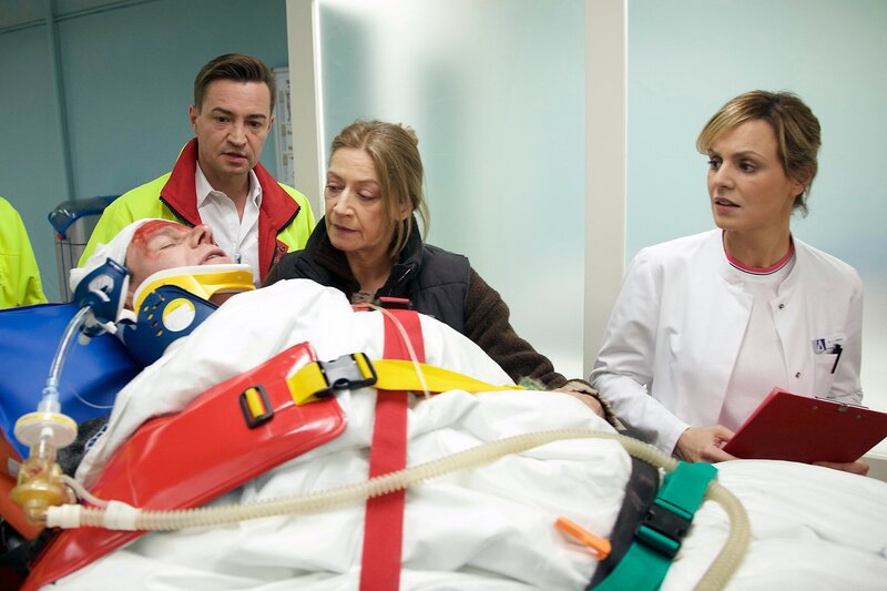 ARD/MDR IN ALLER FREUNDSCHAFT FOLGE 689, "Lauernde Schatten", am Dienstag (16.06.15) um 21:00 Uhr im ERSTEN. Obstbauer Norbert Urban (Olaf Burmeister, liegend) wird vom Notarzt (Markus neumann, li.) nach einem Unfall mit einem Polytrauma eingeliefert. Seine Frau Petra (Tatjana Blacher, mi.) hat nur leichte Schnittwunden und begleitet ihn. Dr. Lea Peters (Anja Nejarri, re.) lässt ihn sofort in den OP bringen.