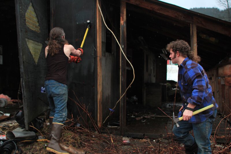 Bam Bam Brown using sledge hammer on demolition site, Gabe Brown with hammer.