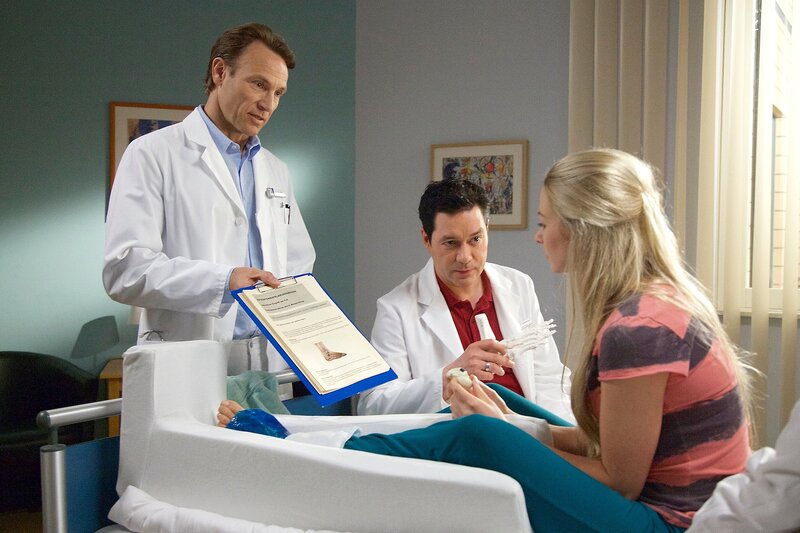 Dr. Philipp Brentano (Thomas Koch, re.) sieht eine Möglichkeit Stephanie Kaluschs (Jenny Bach, mi.) Karriere als Musicaltänzerin zu retten. Doch diese Operation ist riskant. Mit einer speziellen Endoprothese könnte sie möglicherweise wieder tanzen oder nie wieder schmerzfrei gehen. David Junker (Lukas Steltner, li.), Stephanies Freund und Musicalpartner, hält diese Option für zu riskant - vor allem ist ihm bewusst, dass Stephanie nicht gut genug ist, um dieses Risiko einzugehen. Doch David bringt es nicht übers Herz, seiner Freundin das zu sagen.