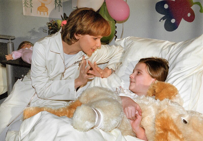 MDR Fernsehen IN ALLER FREUNDSCHAFT FOLGE 65, "Ohnmacht", am Donnerstag (26.04.12) um 12:30 Uhr. Die kleine Anna (Hennriette Naumann, re.) hat einen sehr bösartigen Tumor im Bein. Nachdem die Operation erfolgreich verlaufen ist, machen die Ärzte jedoch eine folgenschwere Entdeckung. Dr. Kathrin Globisch (Andrea Kathrin Loewig, li.) versucht, das Mädchen aufzuheitern.
