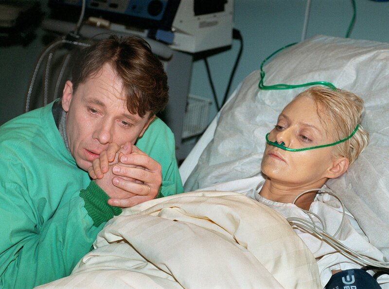 Linda Jakubeit (Michaela Kaspar, re.) kam mit hochgiftigen Chemie-Dämpfen in Kontakt, als sie versuchte Ihren Sohn zu bergen. Peter Jakubeit (Ulrich Wiggers, li.) hat nun Angst um seine Frau, da sie durch den Unfall einen schweren Leberschaden erlitten hat und ein Organversagen innerhalb kürzester Zeit droht.