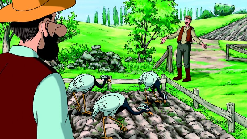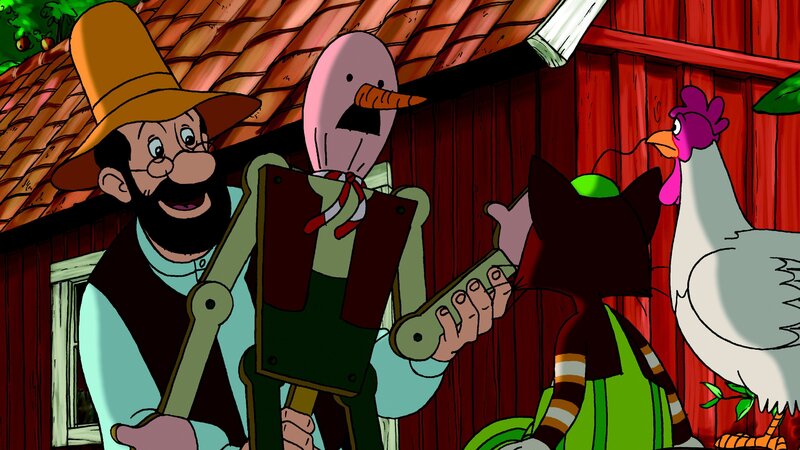 Drei Kraniche landen in Petterssons Kartoffelbeet, tun sich an den Knollen gütlich und lassen sich nicht verscheuchen. Da kommt eine Ornithologin, beobachtet begeistert die Vögel und verbietet Pettersson das Aufstellen einer Spiegel-Apparatur, die die Kraniche ohnehin nicht beeindruckt. Gustavsson will daraufhin mit einer Kanone schießen. Die aber funktioniert nicht. Auf den entsetzten Gustavsson aber schauen die Kraniche völlig verängstigt. Da hat Pettersson eine Idee: eine Vogelscheuche, die aussieht wie sein Nachbar.