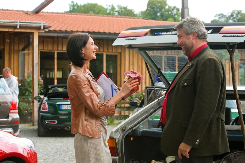 Um Kommissar Stadler (Dieter Fischer, r.) nicht vor den Kopf zu stoßen, nimmt Dr. Eckstein (Petra Einhoff, l.) dessen selbstgemachte Marmelade entgegen.