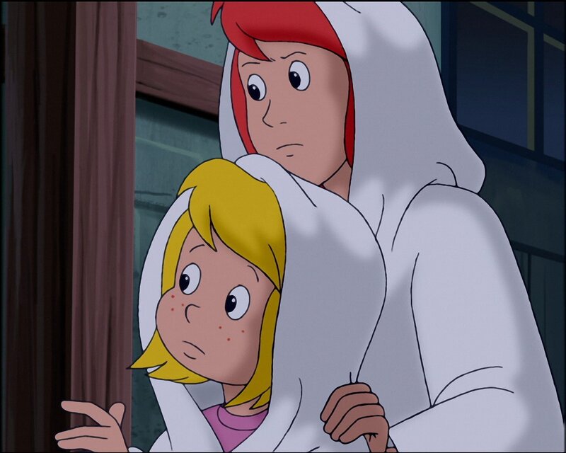 Auf dem Martinshof spukt es. Ein Gespensterreiter treibt sein Unwesen und vergrault die Ferienkinder mit schaurigem Geheule. Bibi und Tina galoppieren ihm hinterher, doch sie erwischen nur seinen weißen Umhang. Damit aber haben sie eine erste Spur und schon tüfteln sie einen Plan aus. Mal sehen, ob ihnen der Gespensterreiter in die Falle geht. Graf von Falkenstein hat die Handwerker im Haus. Doch die zwielichtigen Gesellen sind auf die wertvolle Hufeisensammlung des Grafen scharf. Als sie das Diebesgut in ihren Unterschlupf bringen wollen, kreuzt Tina auf Amadeus ihren Weg. Kurzerhand schnappen sich die beiden Halunken die Mitwisserin und stecken sie in den Keller der Alten Mühle. Siegessicher brechen sie zum zweiten Beutezug auf, doch die beiden haben ihre Rechnung ohne Bibi gemacht.
