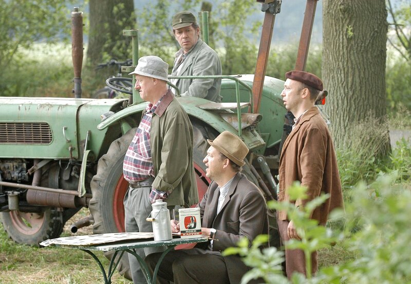 Kuhfladen-Roulette auf der Weide. Shorty (Axel Olsson), Adsche (Peter Heinrich Brix), Kuno (Sven Walser) und Brakelmann (Jan Fedder).