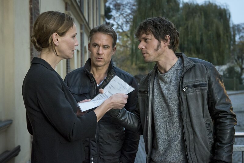 Jan und Tom befragen die Witwe des toten Brauereibesitzers. v.l.n.r.: Ulla Zeidler (Beate Maes), Ina Zimmermann (Melanie Marschke), Tom Kowalski (Steffen Schroeder).