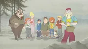 • Xaver, ein Nachfahre der Wikinger, hält das wertvolle Amulett, das Fred gefunden hatte, in seiner Hand und erzählt von den Wikingern. Die 4 1/2 Freunde und Lindi hören gespannt zu.