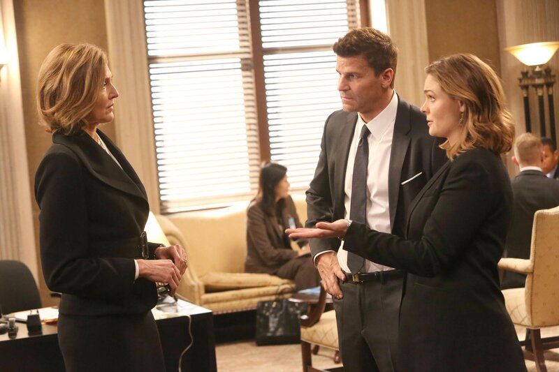 • Booth (David Boreanaz) und Brennan (Emily Deschanel, r.) suchen Senatorin Hayley Winters (Brenda Strong) auf, die fast jede freie Minute mit dem ermordeten Senator O'Malley zusammen war.