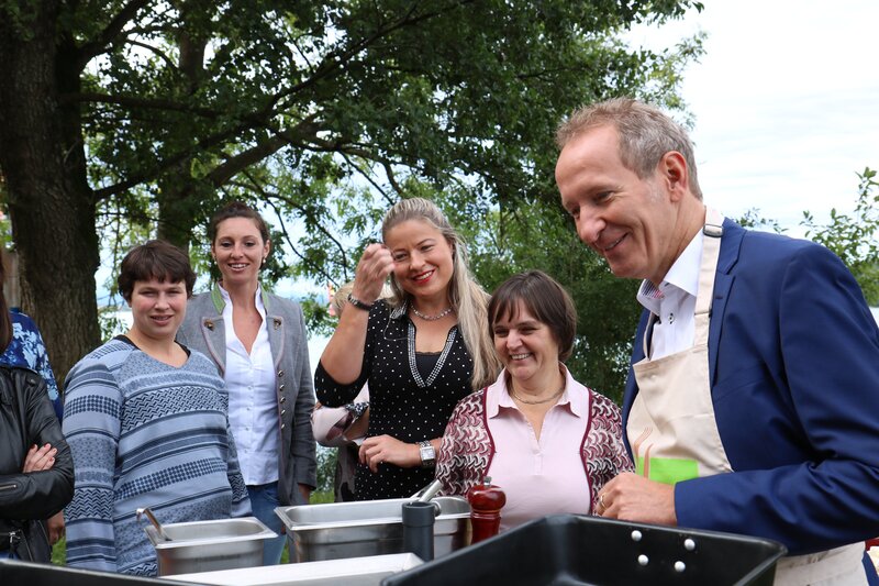 • Tilmann Schöberl als "Grillmeister" mit den Landfrauen. Von links: Katharina Mayer, Cathi Lichtmannegger, Heidi Kaiser, Edeltraud Zehetmeier und Tilmann Schöberl.