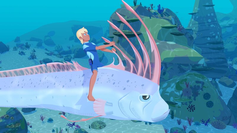 • Yann reitet auf dem "Seeungeheuer", das eigentlich nur ein großer Riemenfisch ist, der seine Brut schützen will.
