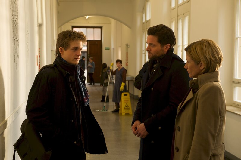 Nach dem Fund eines toten Internatsschülers haben Martina Seiffert (Astrid M. Fünderich, r.) und Jo Stoll (Peter Ketnath, M.) viele Fragen. Sie hoffen, dass der Mitschüler Sebastian Brinkhof (Oskar Bökelmann, l.) wenigstens einige davon beantworten kann.