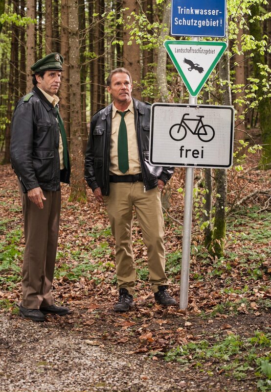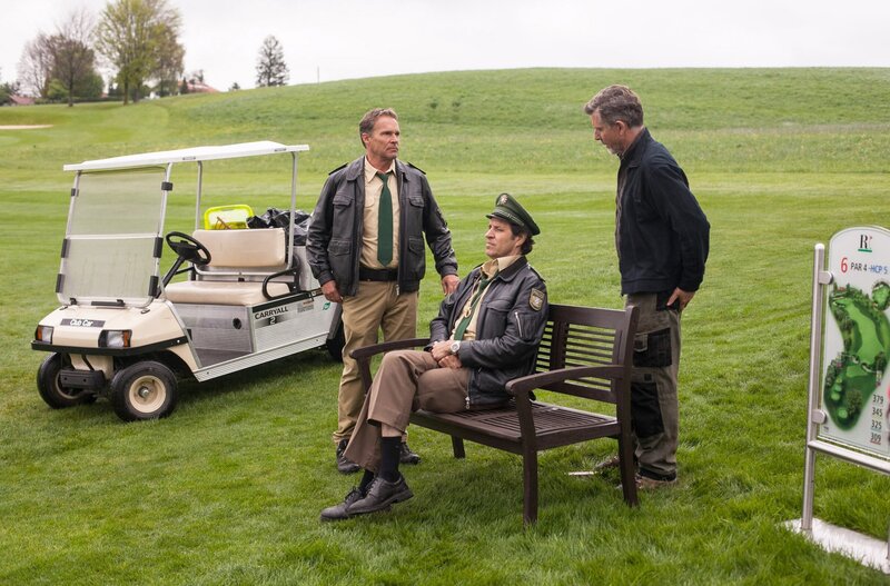 Hubert (Christian Tramitz, rechts) und Staller (Helmfried von Lüttichau) beginnen an den Motiven der „Anti-Golfer“ zu zweifeln. Wurden die Protestler zum Sündenbock gemacht, hinter dem sich der Täter geschickt verstecken konnte?