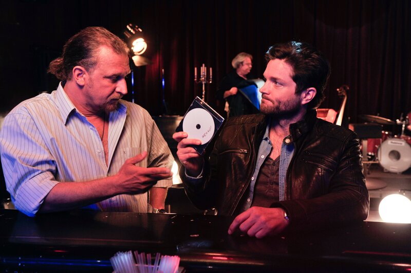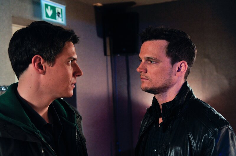 Rico Sander (Benjamin Strecker, li.) ist von der Aussage des Schlagzeugers Peter Krüger (Luk Pfaff, re.) irritiert. Einerseits behauptet er, mit dem Tod des Jazztrompeters nichts zu tun zu haben, andererseits sagt er, dass dieser vermutlich noch am Leben wäre, wenn es ihn nicht gäbe.