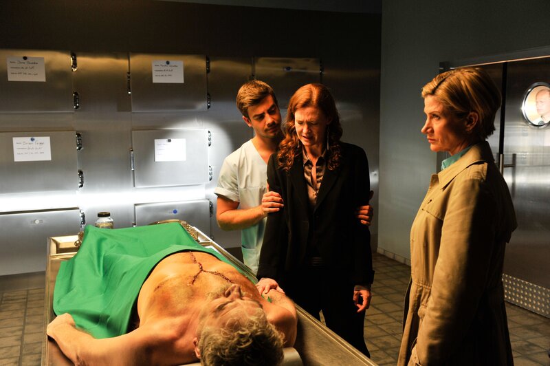 Benedikt Förster (Florian Wünsche, li.) muss Ester Becker (Julika Jenkins, Mi.), die Freundin des toten Jazztrompeters Brian Giggs (Komparse, liegend) stützen. Martina Seiffert (Astrid M. Fünderich, re.) wartet rücksichtsvoll mit ihren Fragen, bis Frau Becker sich einigermaßen gefasst hat.