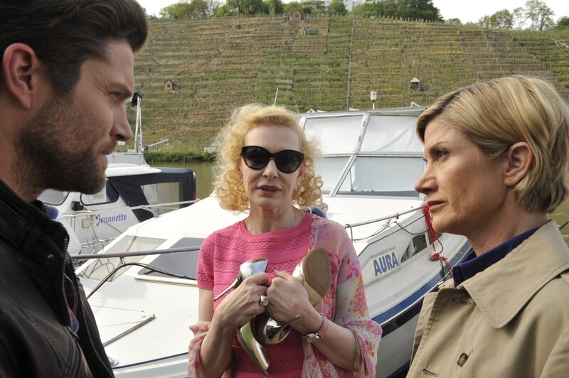 Martina Seiffert (Astrid M. Fünderich, r.) und Jo Stoll (Peter Ketnath, l.) können nicht fassen, was ihnen die Krimischriftstellerin Vicky Heller (Sunnyi Melles, M.) gerade mitgeteilt hat und fragen sich, ob diese so kaltblütig ist, dass sie auch einen Mord begehen würde.