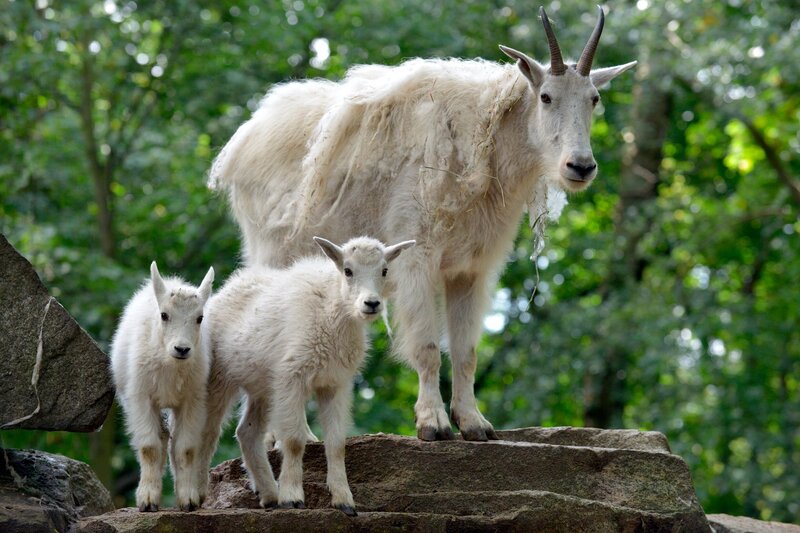 • Schneeziege mit Nachwuchs im Tierpark Berlin.
