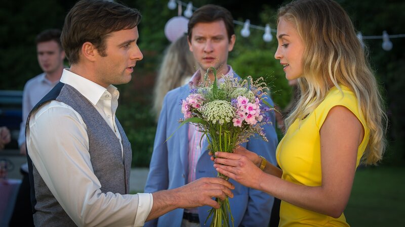 Überraschenderweise taucht Amandas (Teresa Klamert, r.) Ex-Freund Stephen (Jonas Laux, l.) auf ihrer Geburtstagsfeier auf. Ganz zum Unmut ihres neuen Freundes Robert (Adam Ganne, M.).