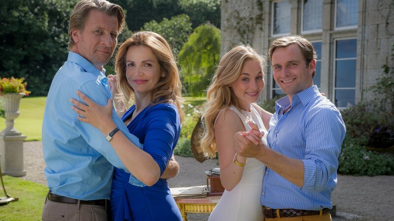 Valentina (Rebecca Immanuel, 2.v.l.) und Jack (Michael von Au, l.) sowie Amanda (Teresa Klamert, M.) und Stephen (Jonas Laux,r.) tanzen im Garten. Im Hintergrund steht ein altes Grammophon.