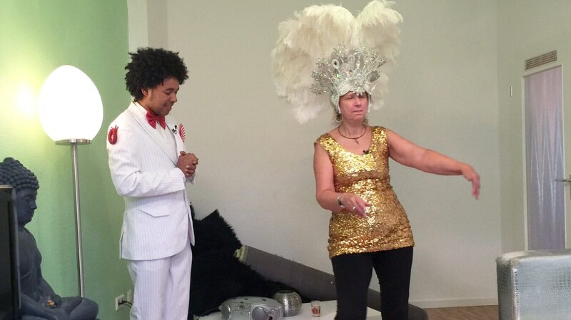 Alex (li.) versucht der esoterischen Tauschfrau Sigrid Samba-Schritte beizubringen