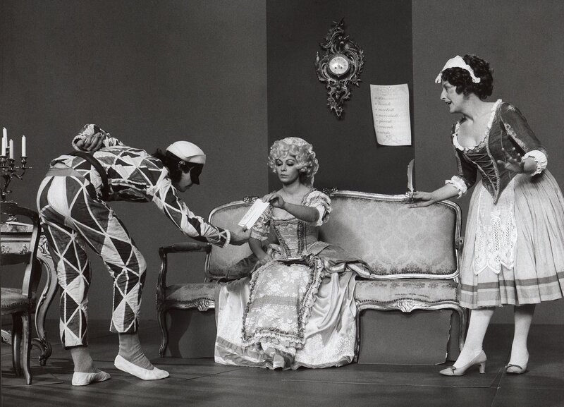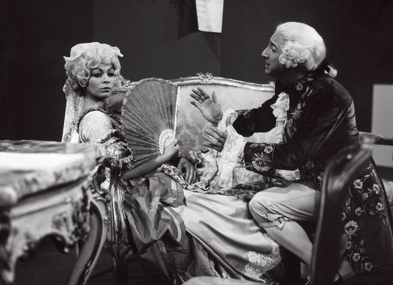 Silvia Luzzi als die eifersüchtig intrigierende Rosaura und Umberto Troni als der unstete Liebhaber Florindo in einer Commedia dell-arte-Szene.